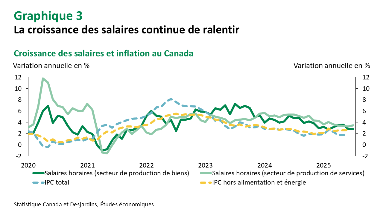 La croissance salariale moyenne est demeurée stable dans le secteur des biens à 2,8 % et s’est légèrement accélérée dans le secteur des services à 3,5 %, mais elle reste inférieure aux sommets de plus de 5 % atteints en 2024 (graphique 3). La croissance des salaires devrait rester modérée pour le reste de 2025, alors que la demande de main-d’œuvre s’essouffle.