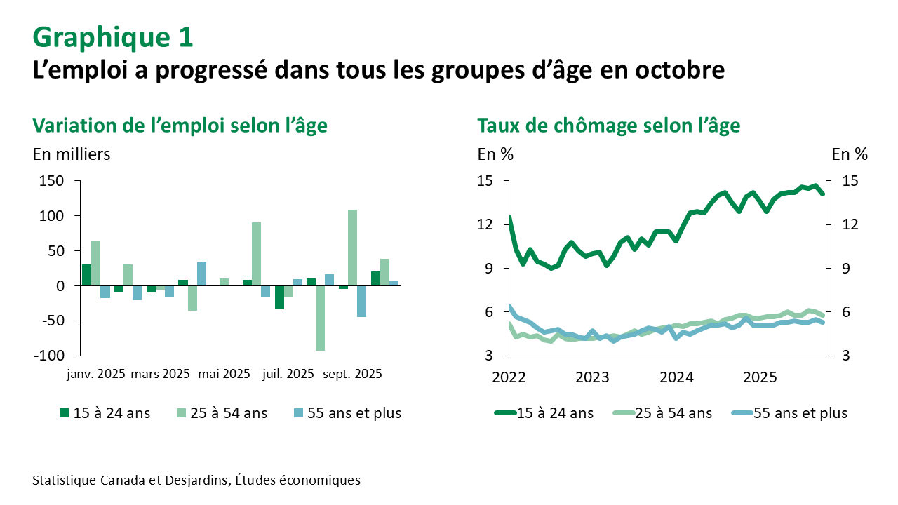 L’emploi au Canada a poursuivi sa progression en octobre, après une forte hausse en septembre. Ces gains cumulatifs compensent largement les pertes enregistrées durant l’été et portent l’emploi total à un nouveau sommet historique. Les secteurs liés au commerce ont mené la hausse, notamment le commerce de gros et de détail, le transport et l’entreposage ainsi que la fabrication. La plupart des provinces ont jusqu’à maintenant connu une croissance de l’emploi en 2025. En Ontario, le solide gain en octobre (55 000) permet à la province de renouer avec la croissance après des reculs plus tôt cette année. Toutefois, la poussée d’octobre repose essentiellement sur le travail à temps partiel (85 100), ce qui masque une baisse de 18 500 postes à temps plein.