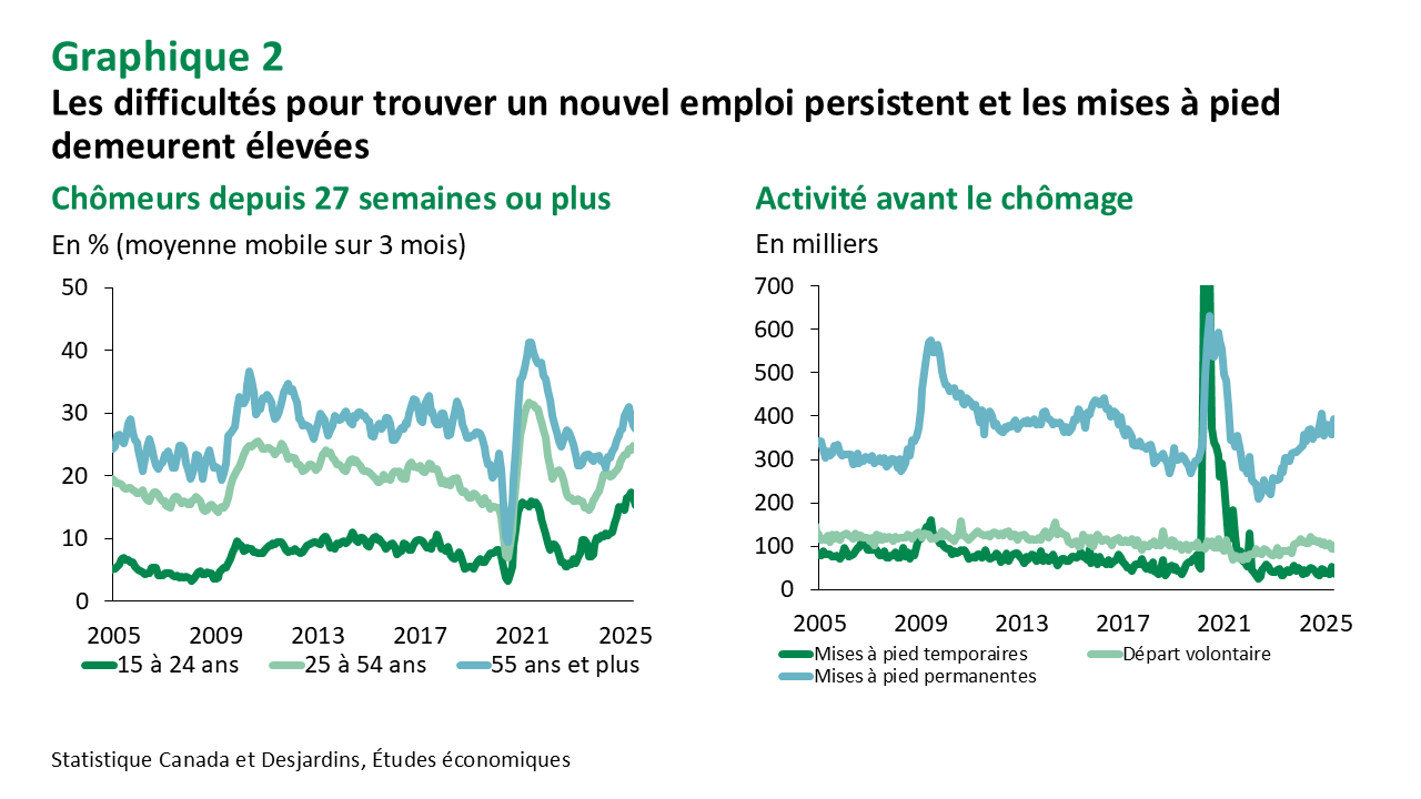 Malgré ces résultats encourageants, le chômage de longue durée reste élevé : près d’un chercheur d’emploi sur quatre dans le groupe des 25 à 54 ans est sans travail depuis au moins six mois (graphique 2). Le nombre de personnes sans emploi à la suite d’une mise à pied permanente continue d’augmenter, bien qu’il demeure inférieur aux niveaux observés en période de récession. Par ailleurs, avoir un emploi ne garantit pas une sécurité financière : Statistique Canada rapporte que 26 % des ménages dont tous les membres travaillent ont de la difficulté à payer les besoins essentiels comme la nourriture et le logement.