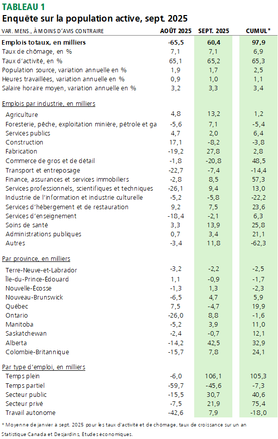 - L’emploi au Canada a progressé de 60 000 postes en septembre 2025, effaçant presque le recul d’environ 65 000 observé en août. Ce résultat a surpris les prévisionnistes, qui anticipaient une hausse modeste de 5 000 emplois. Le taux de chômage est demeuré inchangé à 7,1 %, un résultat légèrement meilleur que prévu. La croissance annuelle du salaire horaire moyen s’est établie à 3,3 %, en légère hausse par rapport au mois précédent. Le tableau 1 présente les principales données.