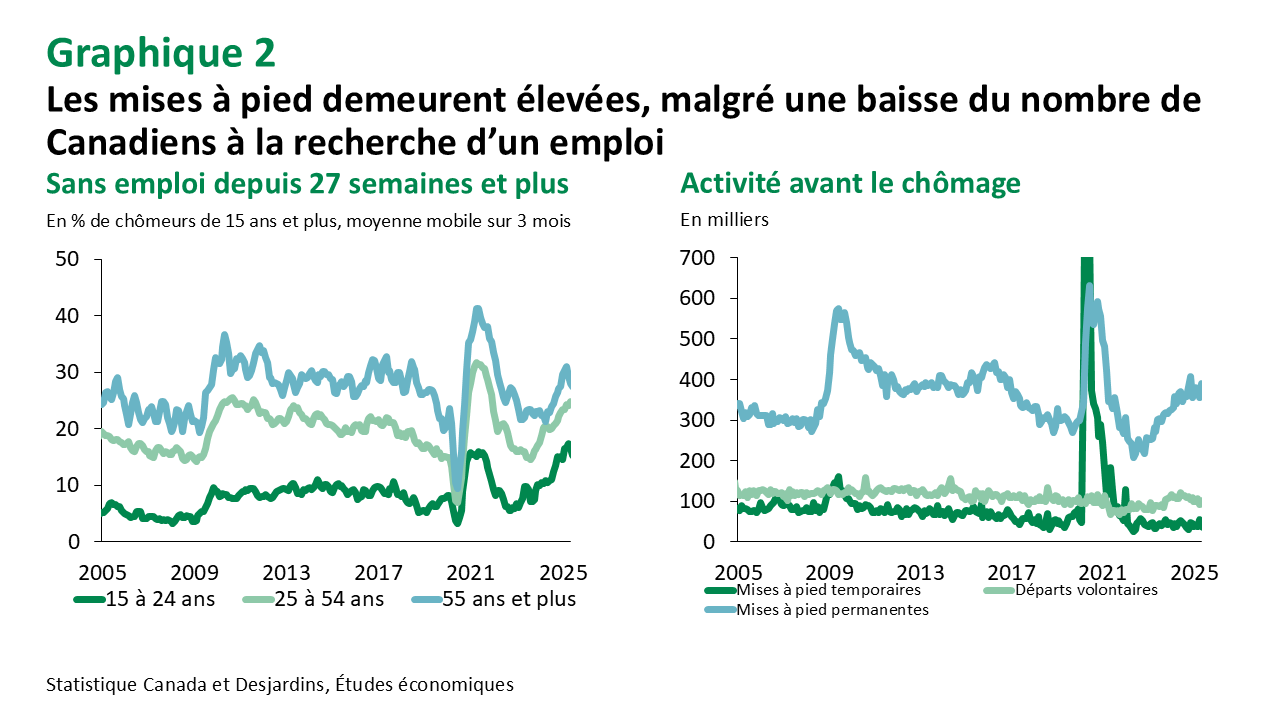 Bien que le taux de chômage global soit demeuré stable, les mises à pied permanentes ont continué d’augmenter, tout en restant sous les seuils typiques d’une récession (graphique 2). Par ailleurs, la proportion de chercheurs d’emploi âgés de 25 à 54 ans en chômage depuis six mois ou plus a légèrement diminué.