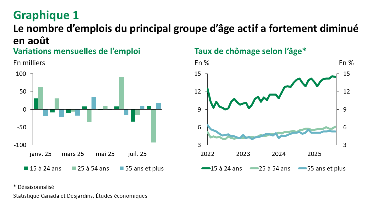 Le taux de chômage a fortement augmenté chez les travailleurs d’âge principal (25 à 54 ans), passant de 5,8 % à 6,1 % en août (graphique 1). Cette hausse s’explique par le fait que les pertes d’emplois ont principalement touché les travailleurs d’âge principal, avec une baisse de 93 000 postes, tandis que 56 000 personnes supplémentaires ont quitté le marché du travail. Au dernier mois du marché de l’emploi estival, les jeunes (15 à 24 ans) ont gagné environ 10 000 postes, ce qui a permis de compenser une partie des pertes du mois précédent, bien que leur taux de chômage demeure élevé. Notre récent rapport a examiné les facteurs expliquant le taux de chômage élevé chez les jeunes.