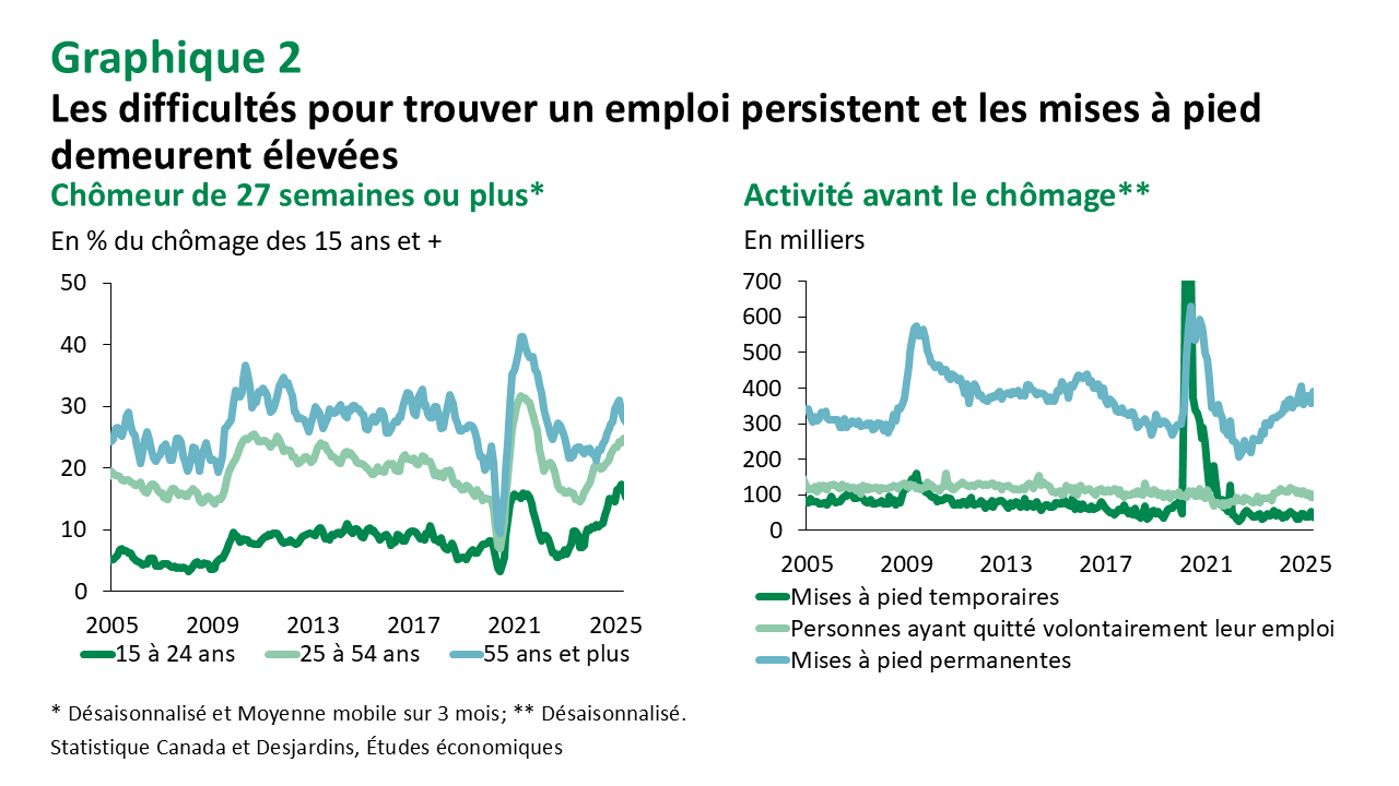 Les conditions du marché du travail continuent de se détériorer, le taux de chômage étant maintenant supérieur de deux points de pourcentage au creux historique atteint il y a trois ans. En effet, le taux de chômage atteint maintenant son plus haut niveau depuis près d’une décennie, en dehors de la période pandémique. Le chômage de longue durée continue d’augmenter, un chercheur d’emploi sur quatre d’âge principal étant sans emploi depuis au moins six mois (graphique 2). Les mises à pied permanentes poursuivent leur hausse, bien qu’elles demeurent sous les niveaux observés en période de récession.