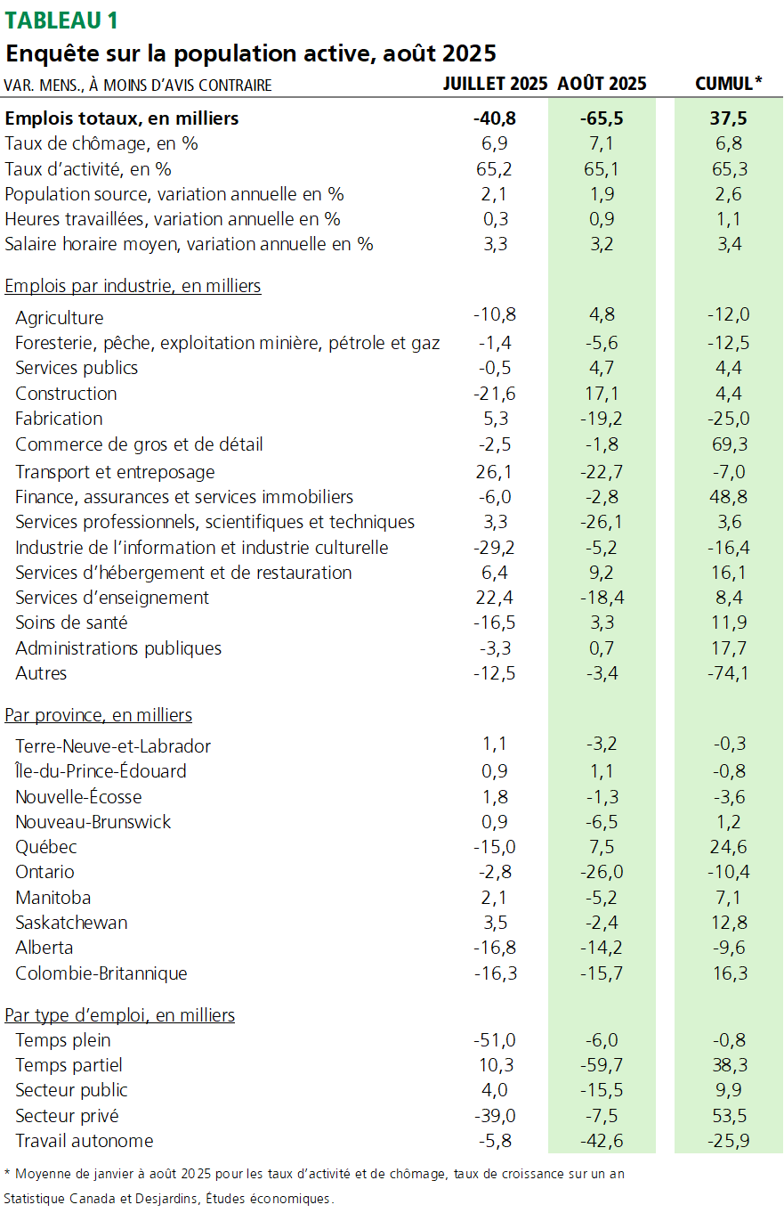 - L’emploi a diminué de 65 500 postes en août 2025 au Canada. Ce résultat décevant fait suite à une baisse de 41 000 emplois en juillet. La publication d’aujourd’hui a surpris les prévisionnistes économiques qui anticipaient, une croissance de 5 000 emplois. Le taux de chômage a augmenté de deux dixièmes pour s’établir à 7,1 %, ce qui est également pire que prévu.