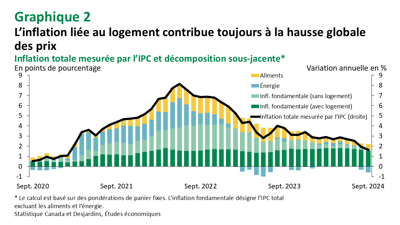 Cela dit, l’inflation liée au logement excluant l’énergie demeure de loin le plus important facteur contributif à l’inflation globale (graphique 2). Bien que la hausse du coût des logements loués ait été le principal élément derrière l’accélération de l’inflation, elle est retombée à un taux toujours élevé de 8,0 % en septembre par rapport à l’année dernière. Nous nous attendons à ce que le ralentissement de cette composante se poursuive au cours des prochains mois, car le rythme de croissance des loyers demandés a considérablement ralenti au cours des derniers mois. Par ailleurs, l’inflation plus importante du coût des logements détenus a ralenti pour s’établir à 5,1 % au cours du mois, la plus faible augmentation en variation annuelle depuis août 2023 et octobre 2021.