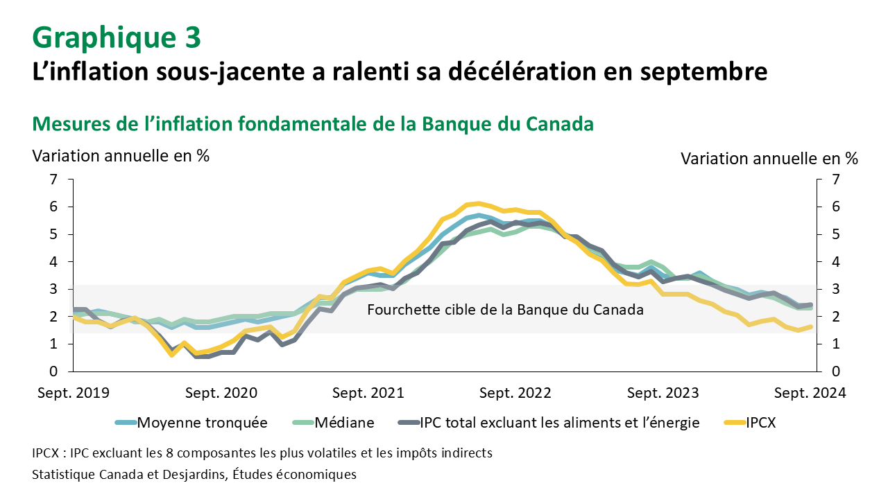 En ce qui concerne l’inflation sous-jacente, les mesures privilégiées par la Banque du Canada (BdC) pour évaluer la croissance des prix de base d’une année à l’autre, soit la médiane de l’IPC et la moyenne tronquée, sont demeurées essentiellement inchangées depuis août (moyenne de 2,4 % en variation annuelle), restant sous la barre des 3 % pour un sixième mois consécutif (graphique 3). Il en va de même pour l’IPC total excluant les aliments et l’énergie du mois de septembre (2,4 %). Toutefois, l’ancienne mesure privilégiée de l’inflation fondamentale de la BdC, l’IPCX (qui exclut les huit composantes les plus volatiles et les impôts indirects), a augmenté d’un dixième de point pour s’établir à 1,6 %. Fait important à noter, les moyennes mobiles de ces données désaisonnalisées ont encore ralenti en septembre, ce qui laisse entendre que la tendance de l’inflation sera perçue d’un bon œil par la Banque du Canada.