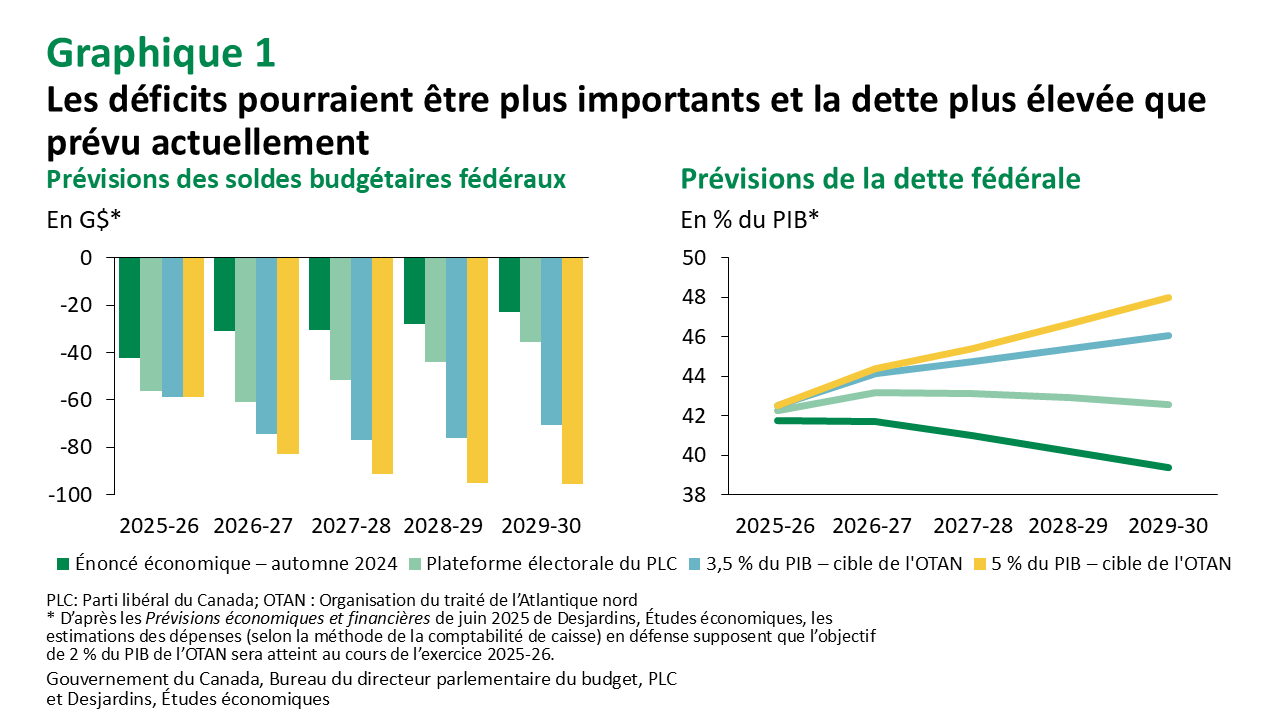 - Nous ne croyons pas que le gouvernement fédéral pourra atteindre la cible de 3,5 % du PIB d’ici 2030. À moins que les dépenses soient réduites ailleurs et/ou que les revenus augmentent pour combler l’écart budgétaire, la hausse graduelle des dépenses militaires à ce niveau d’ici l’exercice 2029‑30 ferait grimper le ratio de la dette fédérale au PIB chaque année des prévisions quinquennales (graphique 1).