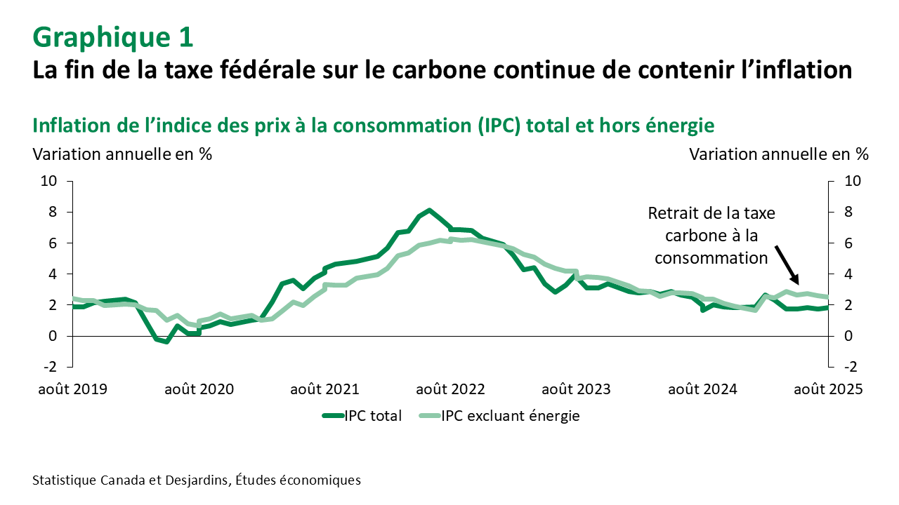 L’inflation globale est demeurée sous la cible de 2 % de la Banque du Canada (BdC) pour un cinquième mois consécutif en août. Cette situation s’explique en grande partie par la baisse des prix de l’énergie par rapport à l’année précédente, attribuable à l’abolition de la taxe fédérale sur le carbone en avril (graphique 1). Sans cette réduction fiscale, l’inflation totale de l’IPC aurait avoisiné 2,4 % en août, après avoir atteint 2,5 % au cours des trois mois précédents. Cela dit, les prix de l’essence ont augmenté de 1,4 % par rapport à juillet, les marges de raffinage plus élevées ayant compensé la baisse des prix du pétrole brut. (Voir notre analyse Lien externe au site. sur les effets inflationnistes de l’élimination du prix fédéral de la pollution.)