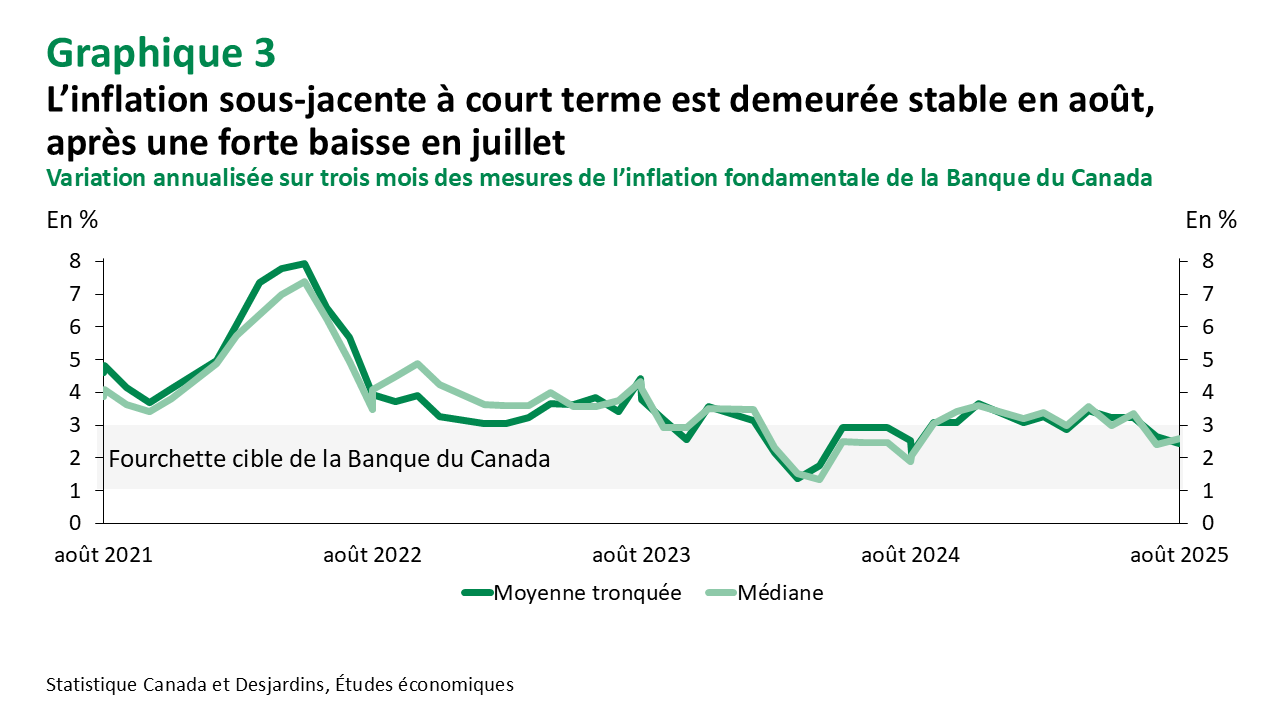 Cependant, l’élément clé en vue de la prochaine annonce de taux de la BdC demeure l’inflation de l’IPC de base. Les mesures privilégiées par la Banque ‒ soit la médiane et la moyenne tronquée de l’IPC ‒ sont restées globalement stables en août, autour de 3,0 à 3,1 % en glissement annuel. La moyenne mobile annualisée sur trois mois de ces séries désaisonnalisées est également demeurée stable, à environ 2,5 %, après une baisse marquée en juillet (graphique 3).