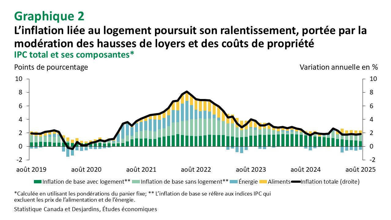 Bien que la baisse des prix de l’énergie ait continué de freiner l’inflation en août, les variations dans les autres catégories de prix ont été plus contrastées. Les prix des aliments ont légèrement augmenté (3,4 % en glissement annuel, comparativement à 3,3 % en juillet), en raison d’une accélération de la hausse des prix de la viande, tandis que le coût des fruits frais a diminué par rapport à l’année précédente. Les prix des services cellulaires sont demeurés inférieurs à ceux de l’an dernier, tout comme ceux des forfaits de voyage, en raison d’une demande plus faible pour les destinations aux États-Unis. Par ailleurs, bien que les tarifs douaniers continuent de contribuer à une inflation sous-jacente plus élevée qu’elle ne le serait autrement, leur effet devrait s’atténuer plus rapidement, puisqu’ils ont été considérablement réduits le 1er septembre (voir notre analyse Lien externe au site.). L’inflation liée au logement a également ralenti en août, les hausses de loyers et de services publics s’étant modérées, tandis que le prix des propriétés résidentielles a poursuivi sa tendance à la baisse (graphique 2).