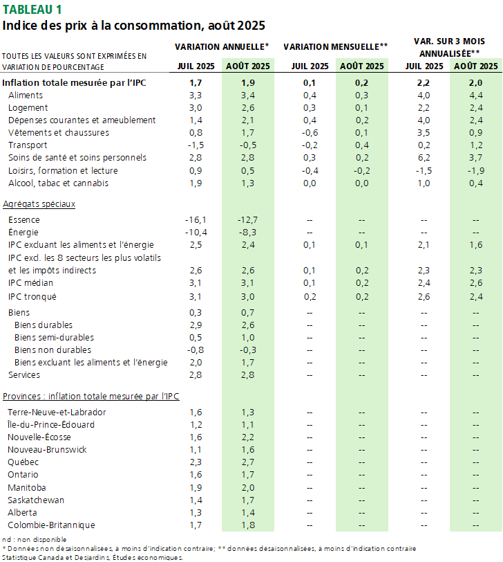 - L’indice des prix à la consommation (IPC) global a augmenté de 1,9 % en glissement annuel en août, après une hausse de 1,7 % en juillet. Ce résultat est légèrement inférieur aux attentes du consensus des économistes, qui s’établissaient à 2,0 %. D’un mois à l’autre, les prix ont reculé de 0,1 %, mais ont progressé de 0,2 % une fois les effets saisonniers pris en compte. Le tableau 1 présente les principales données.