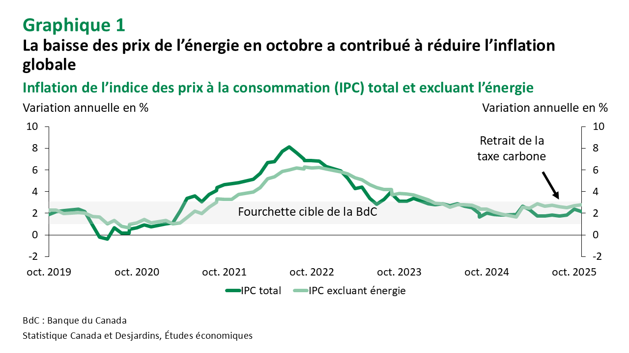 Comme prévu, l’inflation globale s’est rapprochée de la cible de la Banque du Canada (BdC) en octobre. La variation des prix de l’essence a joué un rôle majeur, en recul de 9,4 % sur un an et de 4,8 % par rapport à septembre. La baisse des prix du gaz naturel en Ontario a également contribué à la faiblesse des prix de l’énergie ce mois-ci. De plus, l’inflation globale aurait été environ 0,6 point de pourcentage plus élevée en octobre, soit 2,8 % sur un an, sans l’abolition de la taxe fédérale sur le carbone en avril (graphique 1).