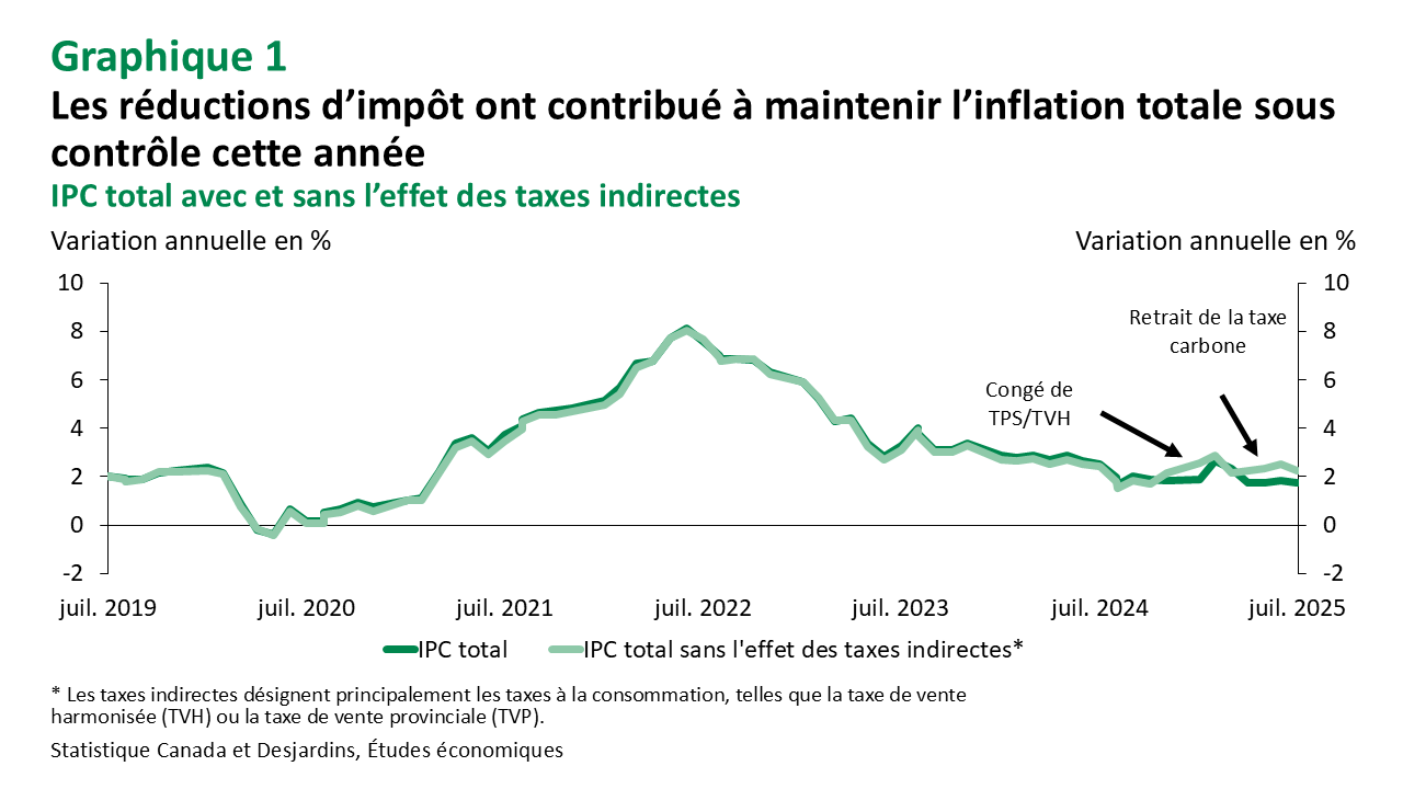 L’inflation globale est demeurée sous la cible de 2 % de la Banque du Canada (BdC) pour un quatrième mois consécutif en juillet. Cette situation s’explique en partie par la baisse des prix de l’énergie par rapport à l’an dernier, attribuable à l’élimination de la taxe fédérale sur le carbone en avril. Sans cette réduction fiscale, l’inflation totale aurait été plus près de 2,2 % sur un an en juillet, bien qu’en recul par rapport à 2,5 % en juin (graphique 1). (Voir notre analyse Lien externe au site. sur l’incidence sur l’inflation de l’élimination du prix fédéral de la pollution.) Par ailleurs, les prix de l’essence ont diminué de 0,7 % d’un mois à l’autre en raison de la baisse des prix du pétrole brut, attribuable à une offre accrue de l’OPEP et à l’apaisement des tensions entre Israël et l’Iran durant le mois.