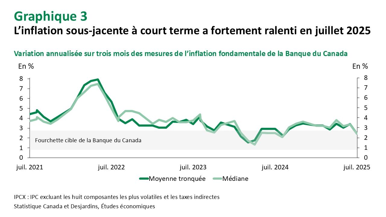 Mais ce que les observateurs de la BdC surveillaient de près en juillet, c’était l’inflation de base de l’IPC. Les mesures privilégiées par la BdC – l’IPC médian et l’IPC tronqué – ont légèrement augmenté en juillet, atteignant en moyenne 3,1 % sur un an, comparativement à 3,0 % en juin. Toutefois, la moyenne mobile annualisée sur trois mois de ces séries désaisonnalisées a fortement ralenti, passant à une moyenne de 2,4 %, contre 3,4 % en juin (graphique 3) – un revirement abrupt, mais bienvenu. Bien qu’il ne s’agisse que d’un mois de données, cela ramène l’inflation sous-jacente à court terme à un rythme inégalé depuis près d’un an et pourrait annoncer un ralentissement de la progression annuelle de l’inflation sous-jacente dans les mois à venir.