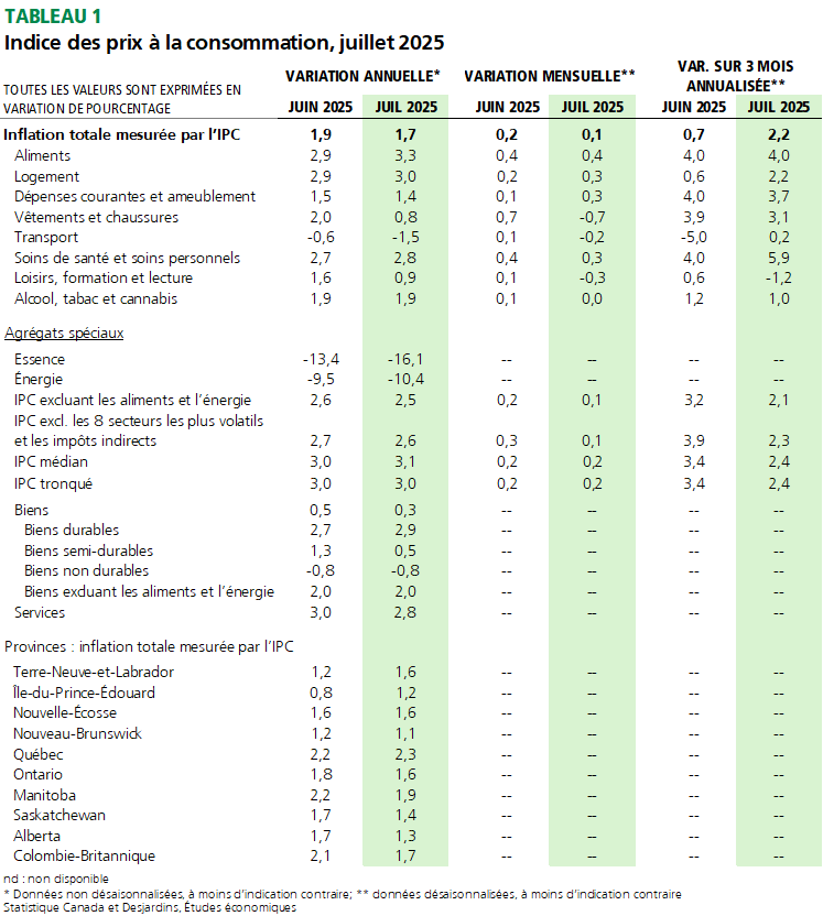 - L’IPC global a augmenté de 1,7 % sur un an en juillet, en baisse par rapport à 1,9 % en juin et légèrement sous les attentes du consensus des économistes (1,8 %).