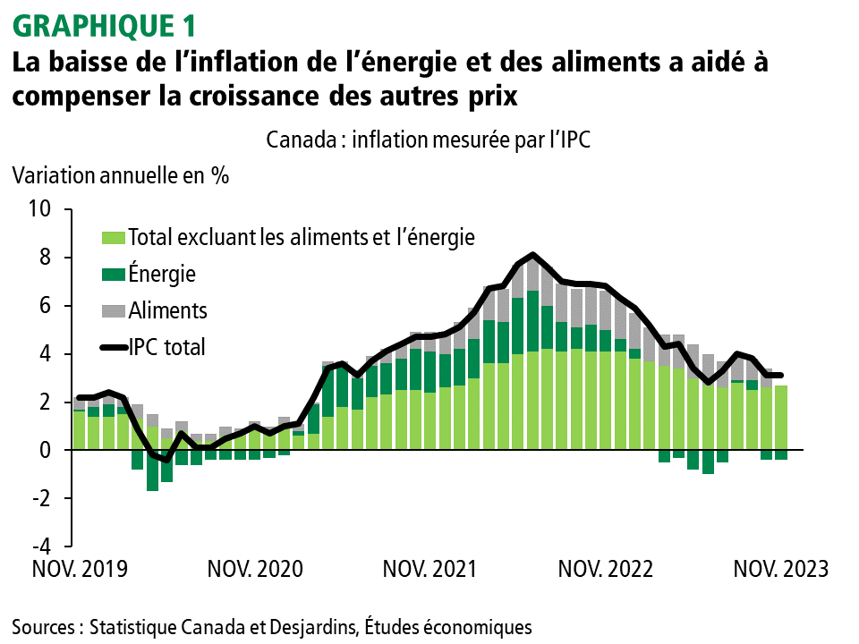Heureusement, il n’y a pas que des mauvaises nouvelles dans la lutte contre l’inflation au Canada. La baisse de 22,6 % des prix des services cellulaires par rapport à il y a un an continue de freiner l’inflation de cette catégorie. D’une année à l’autre, les prix de l’énergie ont également diminué davantage qu’au mois précédent (graphique 1). Ce recul est principalement attribuable à la baisse des prix de l’essence, avec l’aide de la suspension temporaire de la taxe carbone fédérale sur les carburants pour le chauffage. Parallèlement, la progression du prix de l’épicerie a continué de ralentir, les prix des aliments achetés en magasin ayant augmenté de 4,7 % en novembre par rapport à novembre dernier, contre 5,4 % en octobre. Et le refroidissement de la hausse des prix à l’épicerie a été généralisé. Par conséquent, l’inflation des biens a continué de s’améliorer en novembre, tandis que les prix des services sont demeurés pratiquement les mêmes.