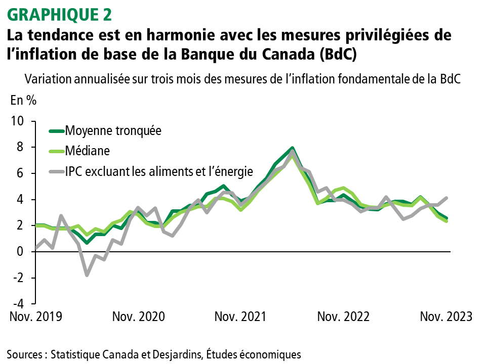 Si l’on examine les données de plus près, on remarque que les indicateurs de l’inflation sous-jacente sont définitivement plus mitigés. Les mesures privilégiées de l’inflation fondamentale de la Banque du Canada (BdC), soit l’IPC médian et la moyenne tronquée, n’ont pas bougé par rapport à octobre. En variation annualisée sur trois mois, ces mesures ont toutes deux perdu 0,4 point de pourcentage pour s’établir respectivement à 2,3 % et à 2,6 % (graphique 2). La mesure traditionnelle de l’inflation de l’IPC total excluant les aliments et l’énergie prise sur la même période a augmenté de 3,6 % à 4,1 %.