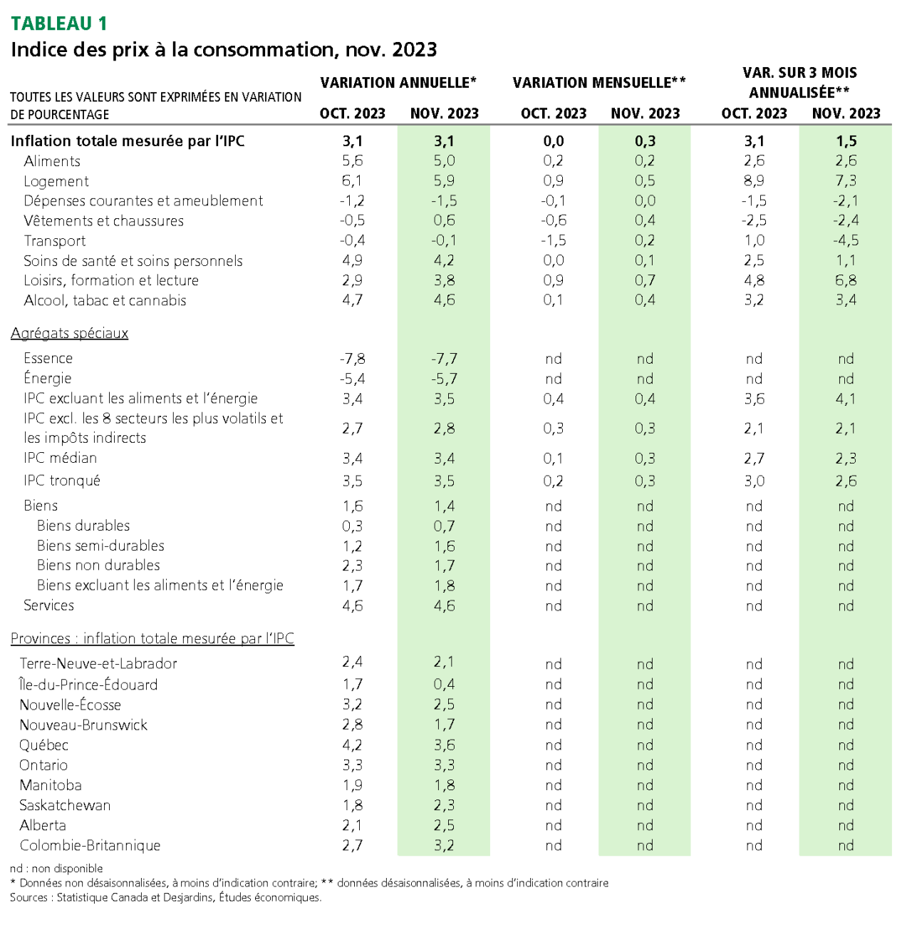- L’IPC global est demeuré inchangé à 3,1 % en novembre par rapport à la même période l’an dernier, ce qui est plus élevé que les prévisions consensuelles des économistes. Pendant ce temps, la croissance mensuelle des prix a bondi de 0,3 % d’un mois à l’autre sur une base désaisonnalisée, ce qui est bien au-delà des chiffres stables d’octobre. Le tableau 1 résume les principales données.