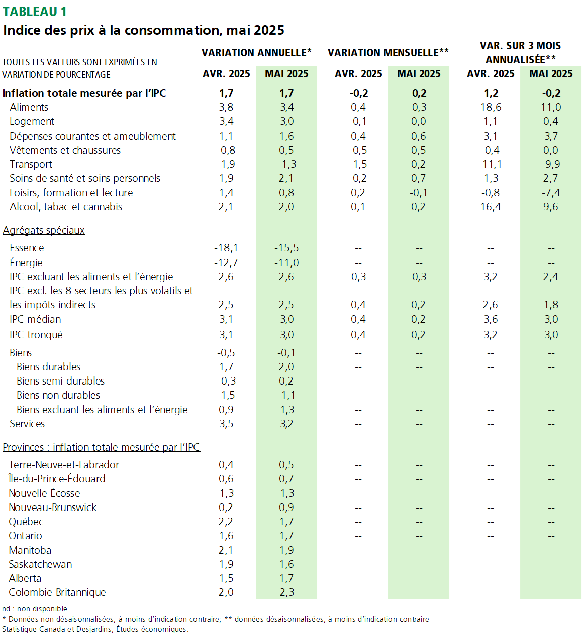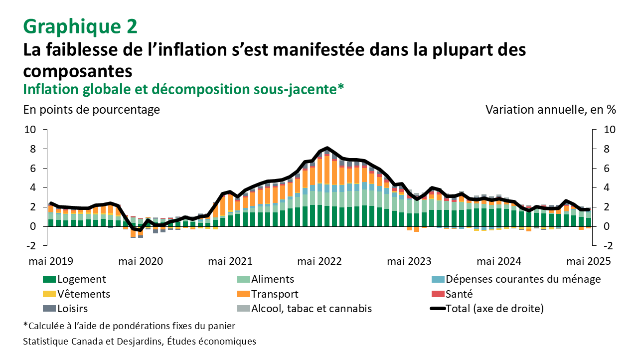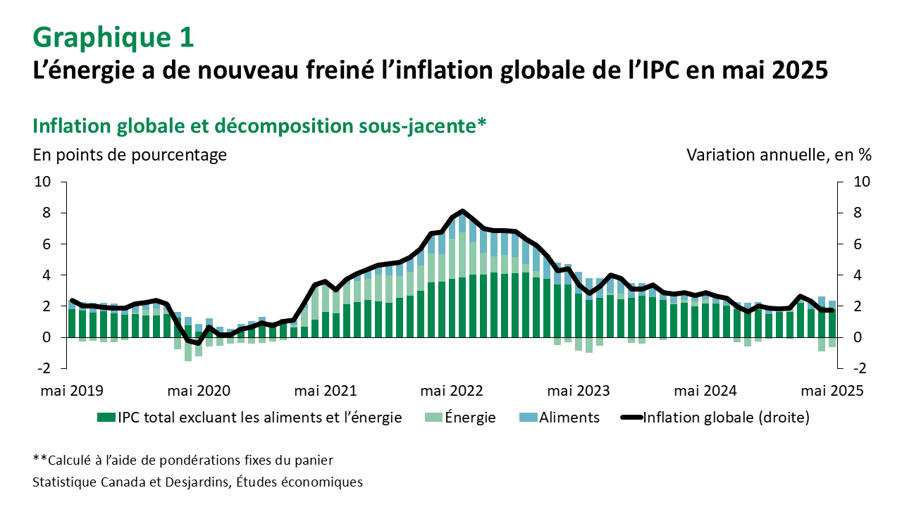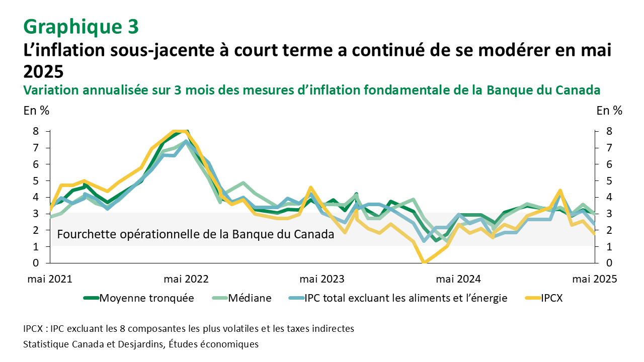 En revanche, l’inflation liée au logement en propriété continue de se modérer, étant passée sous les 4 % en mai, notamment en raison de l’atténuation des pressions provenant de la composante des taux hypothécaires. L’inflation alimentaire s’est établie à 2,9 %, sous la moyenne nationale — malgré les tarifs de représailles —, tandis que les prix de l’énergie ont pour leur part reculé de 6,3 % sur un an.