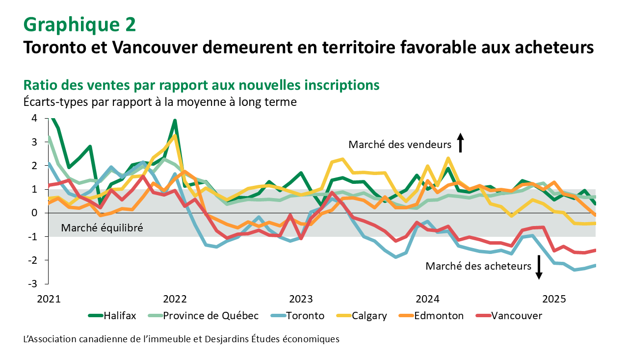 Les disparités régionales sont demeurées marquées. Les ventes de propriétés ont rebondi au Québec, mais le prix de vente moyen a continué de croître, atteignant un nouveau sommet. Malgré une hausse des ventes à Toronto, tant Toronto que Vancouver demeurent en territoire favorable aux acheteurs (graphique 2).