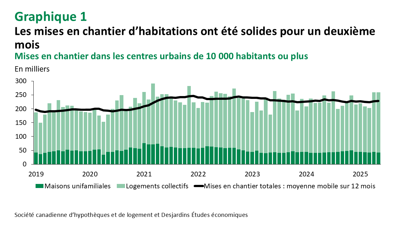 À l’échelle provinciale, la construction résidentielle a continué de progresser fortement au Québec, atteignant des niveaux inégalés depuis le début de 2022. Les provinces des Prairies connaissent également un bon début d’année. À l’inverse, la construction résidentielle a poursuivi son repli en Colombie-Britannique après une reprise d’activité en avril. En Ontario, les mises en chantier ont légèrement augmenté, enregistrant leur deuxième meilleur mois de la dernière année.