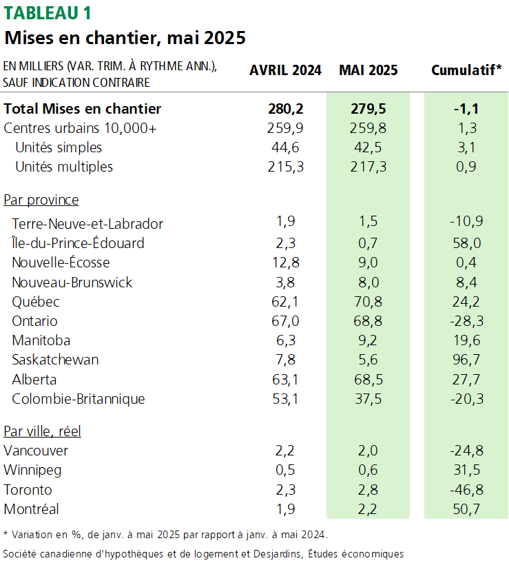 - Le rythme des mises en chantier au Canada est demeuré soutenu à 279 500 unités (taux annualisé désaisonnalisé) en mai, tandis que celui d’avril a été légèrement révisé à la hausse à 280 000 unités. Le tableau 1 résume les principales données.