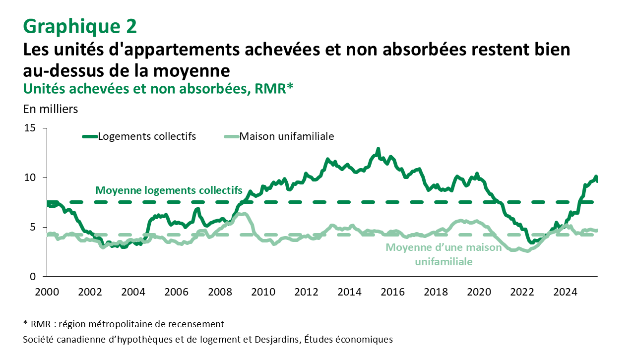 D’autre part, l’offre excédentaire de logements collectifs achevés et invendus demeure importante (graphique 2). Les investisseurs dans les grands marchés pourraient continuer à attendre en raison de la baisse des loyers demandés dans les principaux centres et du coût élevé du financement. En l’absence de préventes suffisantes, les promoteurs pourraient ne pas être en mesure d’obtenir le financement nécessaire pour faire avancer les projets. Bien que certains constructeurs se tournent vers la construction de logements locatifs dédiés, les cibles d’immigration plus strictes du gouvernement fédéral pourraient entraîner une stagnation, voire une légère baisse de la croissance démographique, ce qui réduirait considérablement le bassin de nouveaux locataires.