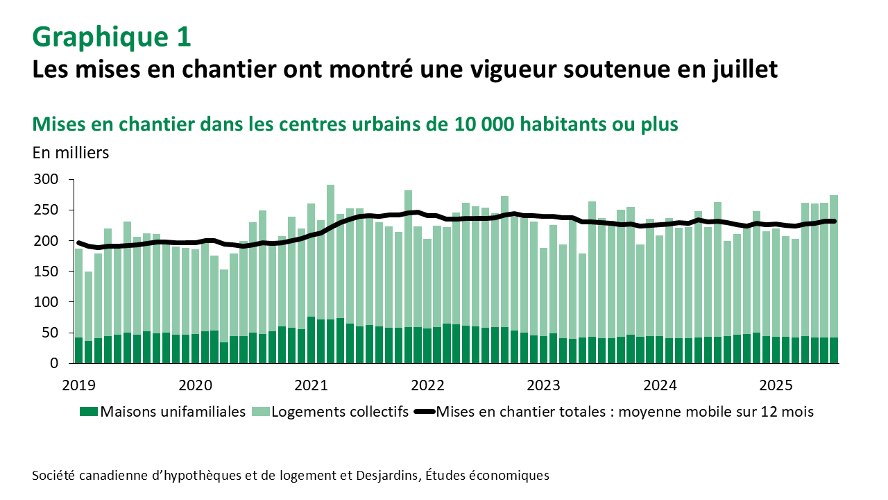 Les mises en chantier désaisonnalisées du mois de juillet ont atteint un sommet de 294 000, dépassant une fois de plus les prévisions des économistes. Cette vigueur est attribuable au segment des logements collectifs, alors que les maisons unifamiliales n’ont montré aucun changement (graphique 1).