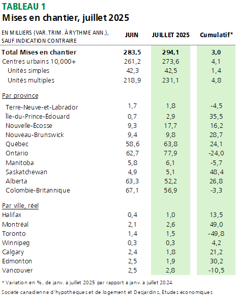 - Le rythme des mises en chantier au Canada a de nouveau augmenté, atteignant 294 000 (taux annualisé désaisonnalisé) en juillet. Le tableau 1 résume les principales données.