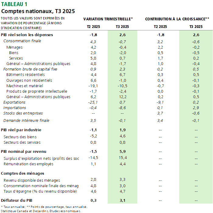 - La croissance du PIB réel a progressé à un rythme annualisé de 2,6 % au troisième trimestre de 2025, bien au‑dessus du consensus des prévisionnistes et des perspectives de la Banque du Canada (0,5 %). Le tableau 1 présente plus de détails sur les résultats.