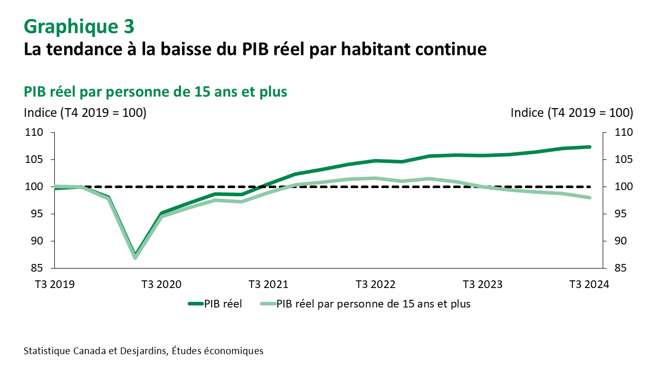 Nous prévoyons actuellement une croissance annualisée du PIB réel de l’ordre de 1,5 % à 2,0 % au quatrième trimestre, ce qui est légèrement inférieur à la prévision de 2,0 % de la BdC. Malgré les révisions à la hausse, le PIB réel par habitant continue de chuter (graphique 3). En effet, un troisième mois consécutif de gains d’emplois en octobre Lien externe au site. n’a pas suffi à contrebalancer la croissance de la population, qui continue de surpasser la demande de main-d’œuvre. Il s’agit là d’un signe persistant d’un refroidissement du marché du travail. De plus, l’économie fait face aux importants vents contraires émanant de la vague de renouvellements hypothécaires à venir et du ralentissement de la croissance démographique. Enfin, la menace de tarifs douaniers envisagés par la deuxième administration Trump ajoute un degré élevé d’incertitude et accroît les risques de baisse de la croissance et de l’inflation Lien externe au site.. Par conséquent, nous nous attendons à ce que la BdC abaisse à nouveau le taux directeur à cinq reprises en 2025 afin de contrer les pressions baissières sur les perspectives économiques.