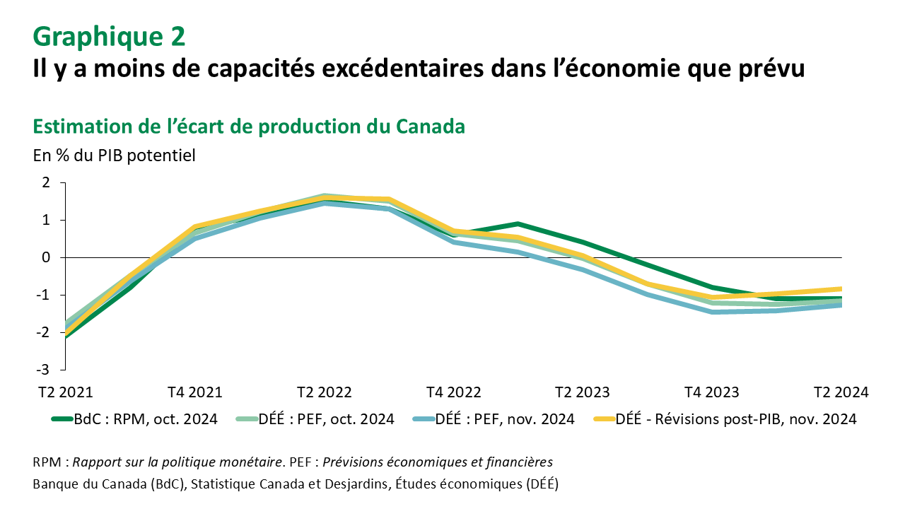 Mais le changement le plus important pour la BdC est peut-être la révision à la hausse du PIB réel. Celle-ci nous a amenés à revoir également à la hausse notre estimation de l’écart de production pour le deuxième trimestre de 2024 : il a augmenté d’environ 0,5 point de pourcentage, passant de -1,3 % à -0,8 %. Cette estimation de l’écart de production est maintenant nettement moins négative que celle de la BdC dans son Rapport sur la politique monétaire (RPM) d’octobre 2024, à -1,2 %. Cela suggère qu’il y a moins de capacités excédentaires dans l’économie canadienne que ce qui était initialement prévu (graphique 2). Cela renforce notre prévision d’une baisse de taux de 25 points de base (plutôt que de 50) à la prochaine réunion de la BdC.