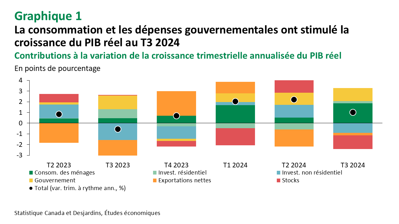 Si la croissance du PIB canadien s’est établie près des attentes, on ne peut pas dire que le moteur économique du Canada roule rondement. D’abord, les investissements des entreprises ont reculé en raison d’une déduction des dépenses dans les aéronefs et les bateaux, qui a coïncidé avec une baisse des importations de ces mêmes biens au cours du trimestre. Si l’on combine cela à un nouveau déclin des exportations en termes réels, les exportations nettes ont contribué négativement à la croissance au troisième trimestre. À l’inverse, l’investissement résidentiel a connu une progression modeste grâce à une hausse des activités de revente de propriétés. Par ailleurs, la consommation a été vigoureuse dans toutes les catégories, particulièrement du côté des biens durables grâce aux ventes d’automobiles. La consommation des gouvernements a également augmenté pour un troisième trimestre consécutif, les dépenses ayant progressé à tous les niveaux de gouvernement (graphique 1). Du côté des revenus des entreprises, des pertes dans les secteurs manufacturier, de gros et de détail ont entraîné un déclin. La rémunération des employés a connu une autre bonne progression au troisième trimestre (7,1 % annualisée). Cela a permis au taux d’épargne de grimper à 7,1 %, comparativement à 6,2 % au deuxième trimestre. Cependant, le taux d’épargne moyen des trois dernières années a été révisé à la baisse de 1,5 point de pourcentage.