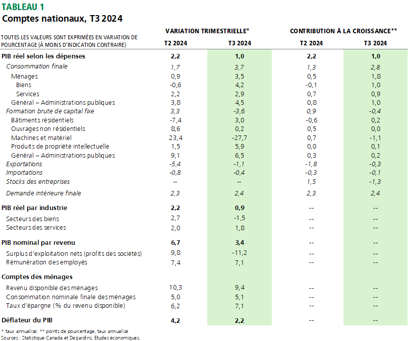 - Le PIB réel a progressé à un rythme annualisé de 1,0 % au troisième trimestre de 2024. Ce résultat est inférieur d’un dixième de point au consensus des prévisionnistes, et bien en deçà de la prévision de la Banque du Canada (BdC), à 1,5 %. Le tableau 1 donne plus de détails sur les résultats.