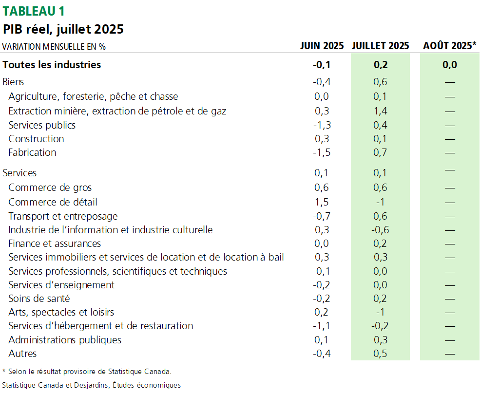 - Le produit intérieur brut (PIB) réel du Canada a augmenté de 0,2 % en juillet 2025, après un léger recul le mois précédent. Ce résultat dépasse les attentes des prévisionnistes économiques ainsi que l’estimation préliminaire de Statistique Canada. Onze des vingt sous-secteurs ont enregistré une croissance durant le mois. Voir le tableau 1 pour plus de détails.
