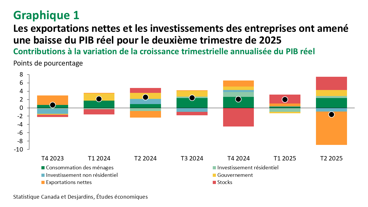 Les effets des tarifs douaniers américains sur l’économie canadienne sont désormais évidents. Les exportations nettes ont été la principale source de ralentissement, en lien avec les tarifs imposés par les États‑Unis (graphique 1). En excluant la pandémie, le recul du solde commercial est le plus marqué depuis le début de la série de données en 1961. La baisse des exportations (-26,8 % en rythme annualisé) est généralisée et touche des biens tels que les véhicules automobiles, les machines, les équipements et les pièces. Les exportations de services de voyage ont également diminué, probablement en raison d’une réduction des déplacements entre le Canada et les États‑Unis. De plus, l’incertitude liée aux tarifs a contribué à la baisse des investissements en machines et équipements (-32,6 %).