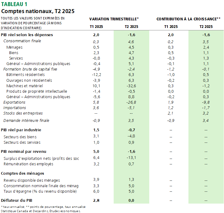 - La croissance du PIB réel a reculé à un rythme annualisé de 1,6 % au deuxième trimestre de 2025. Ce résultat est inférieur au consensus des prévisionnistes (-0,7 %), mais proche de celui de la Banque du Canada (-1,5 %). Le tableau 1 présente plus de détails.