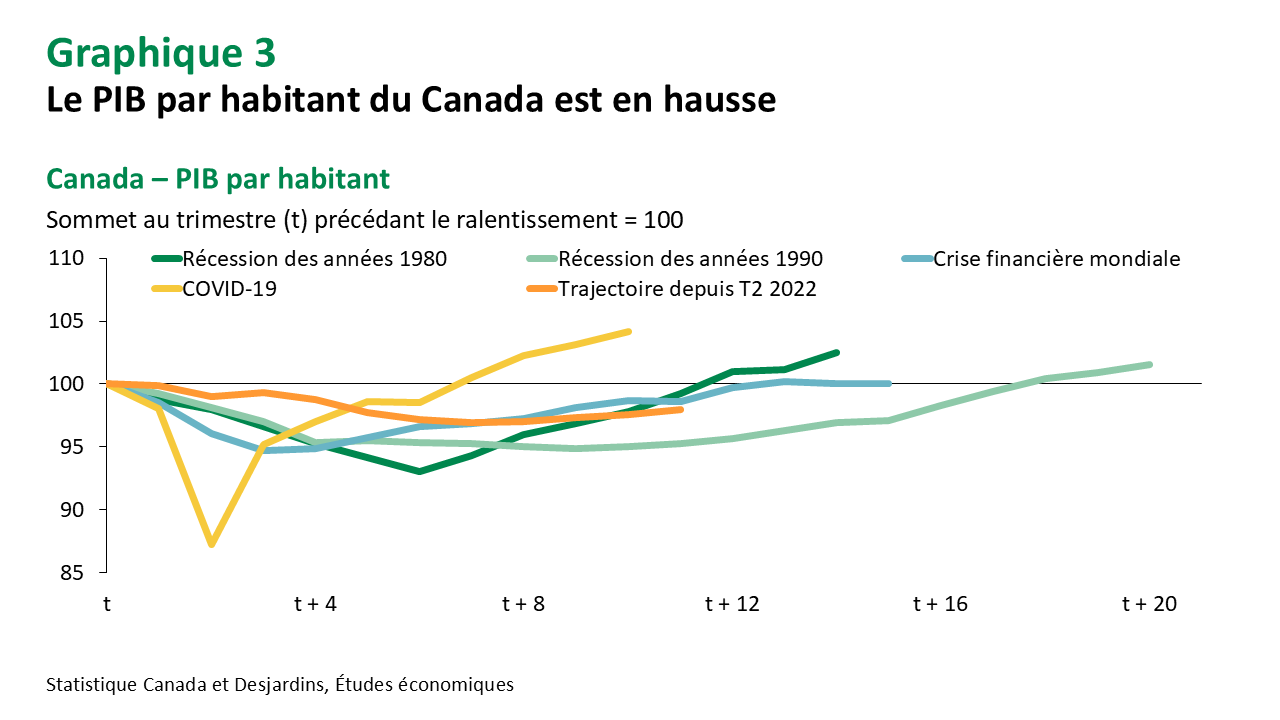 En se tournant vers l’avenir, la baisse des RNP et le rythme plus lent de l’immigration devraient probablement mener à une augmentation du PIB réel par habitant au Canada (graphique 3). Mais le ralentissement de la croissance démographique devrait également représenter un frein à la croissance économique nationale. Cela va s’ajouter aux tensions commerciales avec notre voisin du Sud et au mur de renouvellements hypothécaires qui devraient limiter la croissance à court terme. Nous nous attendons à ce que ces défis restent au centre des préoccupations de la banque centrale, alors qu’elle tente de concilier la récente hausse de l’inflation avec le ralentissement en cours de l’économie.