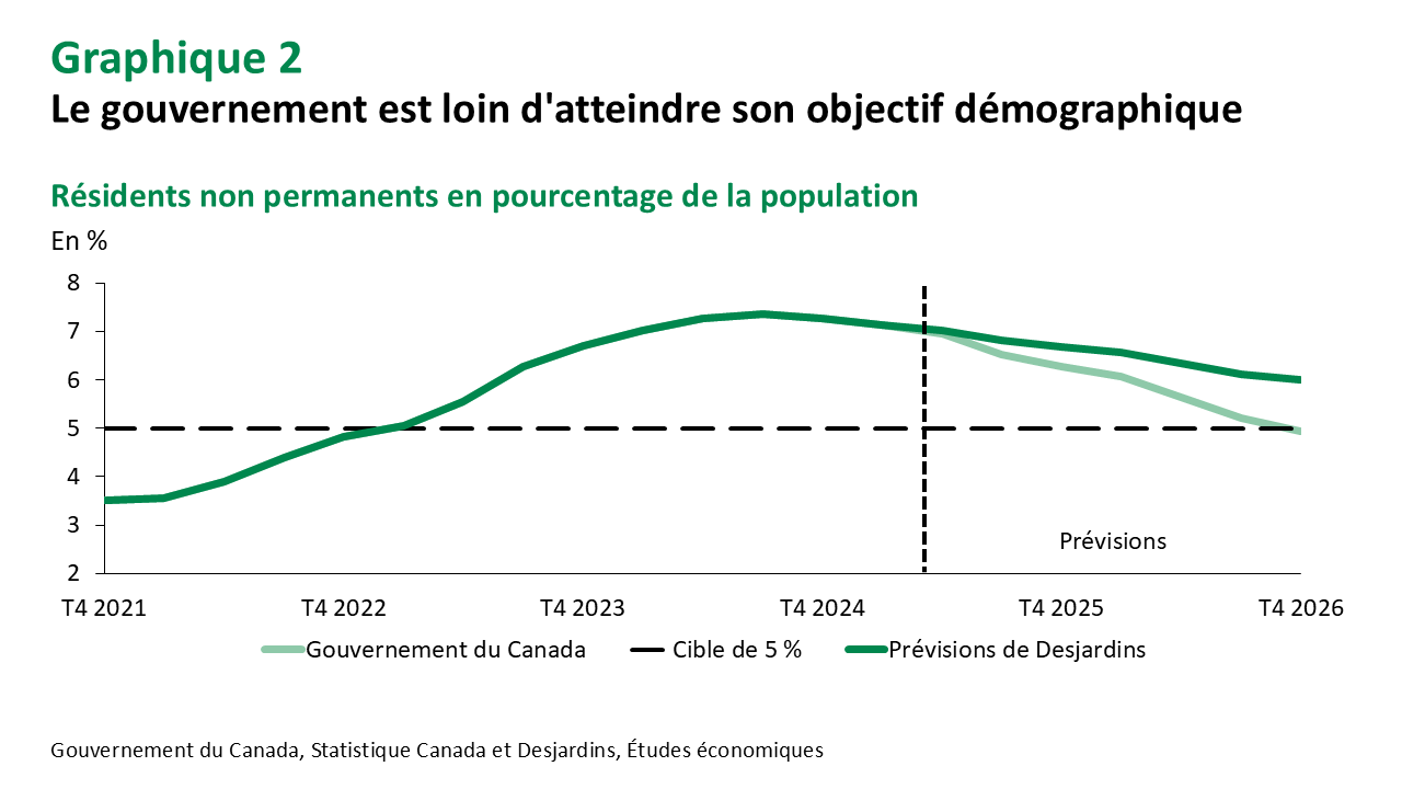 Afin de mettre les dernières données démographiques en contexte, nos recherches Lien externe au site. montrent que le gouvernement fédéral est encore loin de ses objectifs en matière de démographie (graphique 2). L’atteinte de ceux-ci nécessitera moins de nouveaux arrivants et plus de départs de la part des RNP.