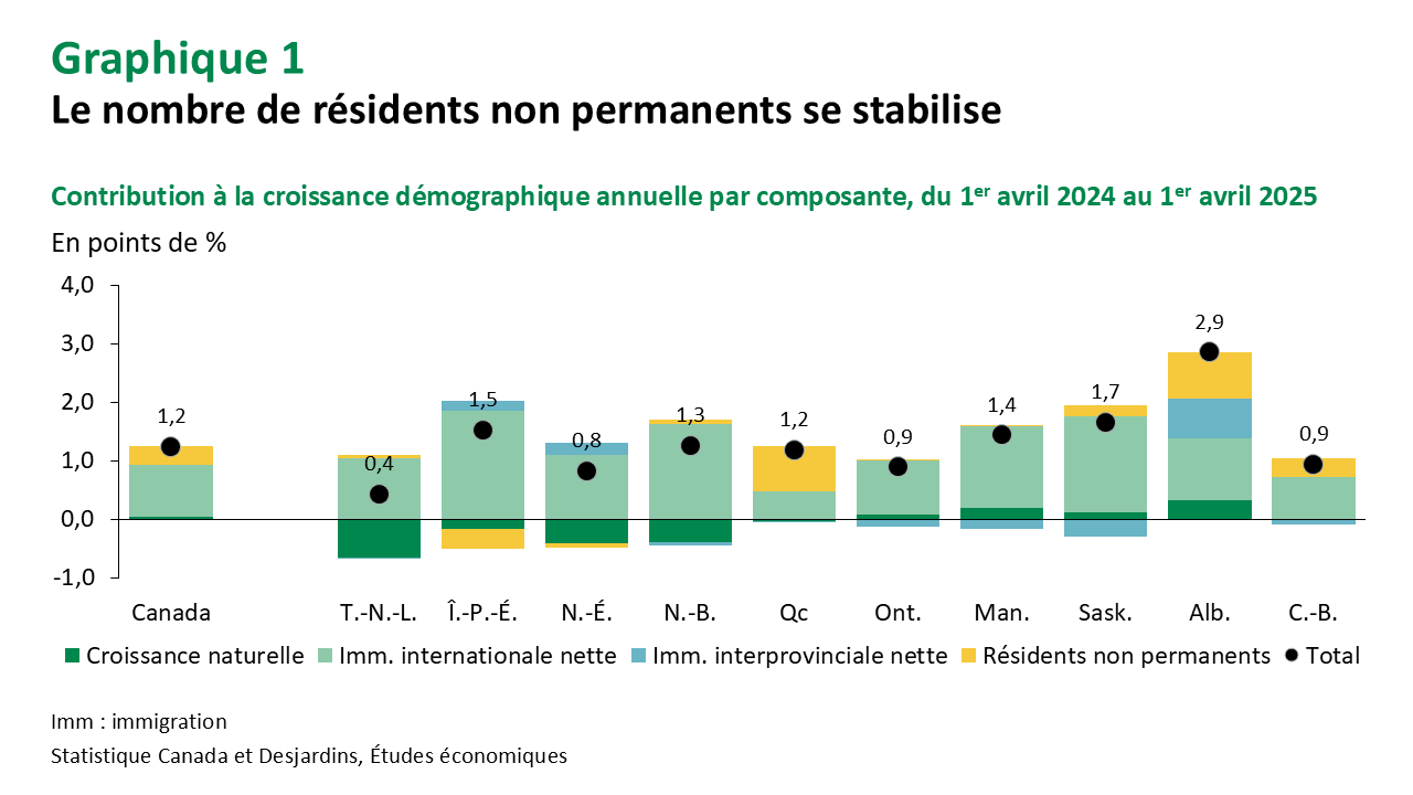 Parmi les provinces, notons que l’Alberta, la Colombie‑Britannique, le Nouveau‑Brunswick, le Québec et la Saskatchewan ont continué d’avoir un afflux de RNP au T1 2025. L’immigration reste élevée dans la plupart des provinces, le Nouveau‑Brunswick, l’Île‑du‑Prince‑Édouard et la Saskatchewan affichant la plus forte croissance annuelle (graphique 1). L’Ontario, la province la plus peuplée, n’a presque pas contribué à la croissance démographique des RNP au début de l’année. Comme indiqué dans nos recherches Lien externe au site., la modération des niveaux de RNP devrait contribuer à atténuer les pressions inflationnistes, en particulier dans les villes où l’accessibilité au logement est la plus problématique, comme Toronto et Vancouver. Mais cela risque évidemment d’entraîner un ralentissement notable dans ces marchés immobiliers pour un certain temps.