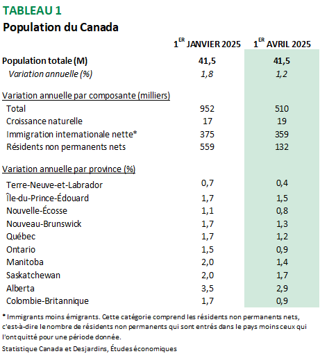 - La population du Canada a à peine changé du 1er janvier au 1er avril 2025, augmentant de 20 000 pour atteindre 41,5 millions de personnes.