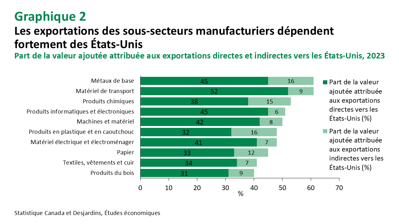 Le secteur manufacturier demeure particulièrement vulnérable aux fluctuations de la demande transfrontalière. Statistique Canada souligne que plus de 40 % de la production et de l’emploi manufacturiers sont directement liés au marché américain. Les sous-secteurs de la première transformation des métaux et de la fabrication de matériel de transport figurent parmi les plus exposés en matière d’exportations vers les États-Unis (voir graphique 2). Par ailleurs, l’activité dans le secteur de l’extraction des ressources est demeurée stable en avril. Les baisses observées dans l’extraction de pétrole, de gaz naturel et de minerais ont été contrebalancées par des hausses dans les services de soutien à l’extraction.
