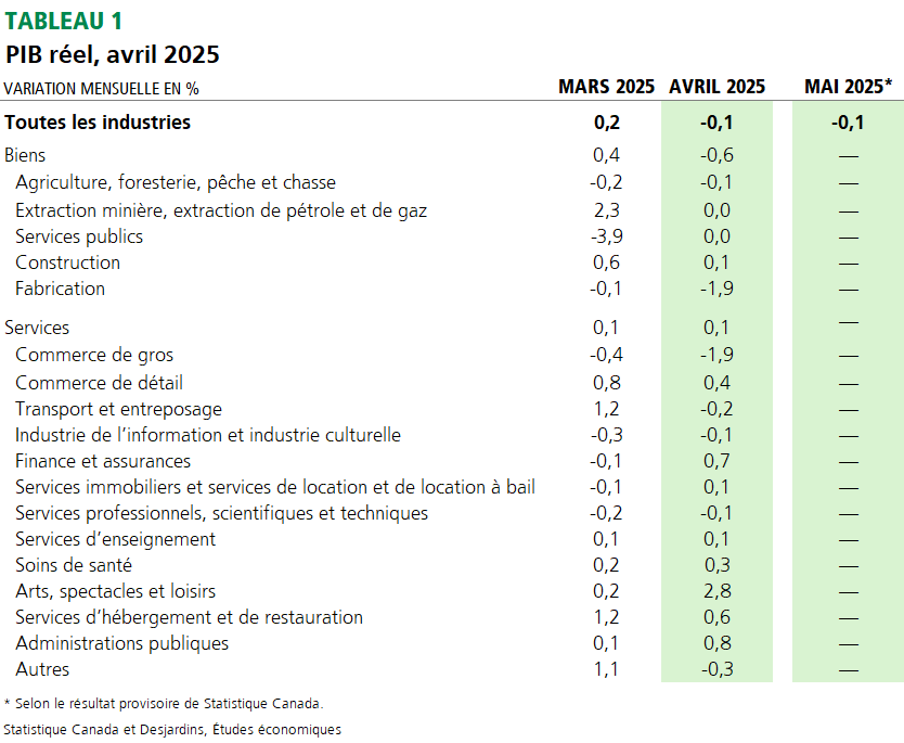 - Le produit intérieur brut (PIB) réel du Canada s’est contracté de 0,1 % en avril 2025, après avoir enregistré une croissance modeste de 0,2 % en mars. Ce repli s’est avéré plus marqué que prévu, l’estimation préliminaire de Statistique Canada anticipant une légère hausse de 0,1 %, tandis que le consensus des économistes tablait sur une stagnation. La moitié des 20 grands secteurs d’activité ont affiché un recul de leur production au cours du mois. Pour un aperçu détaillé des variations sectorielles, voir le tableau 1.