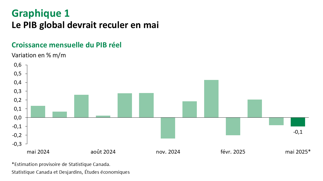 - L’estimation provisoire de Statistique Canada suggère un nouveau recul de 0,1 % du PIB réel en mai (voir graphique 1). En supposant une stabilité de l’activité économique en juin, cela impliquerait une contraction annualisée de 0,3 % du PIB réel par industrie au deuxième trimestre de 2025. Cette estimation est conforme à celle présentée dans nos Perspectives économiques et financières de juin 2025 Lien externe au site..