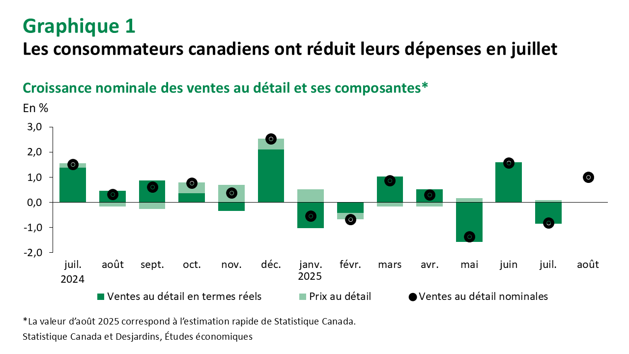 - L’estimation préliminaire de Statistique Canada pour le mois d’août fait état d’une croissance de 1,0 % des ventes au détail. Si cette estimation se confirme, elle serait principalement attribuable à un redressement des volumes, les prix des biens ayant augmenté de façon modérée (+0,2 %) durant le mois.