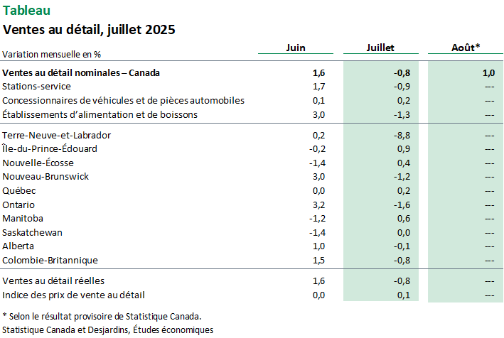 - Les ventes au détail ont diminué de 0,8 % en juillet par rapport au mois précédent, conformément aux attentes du consensus des économistes et à l’estimation provisoire de Statistique Canada.