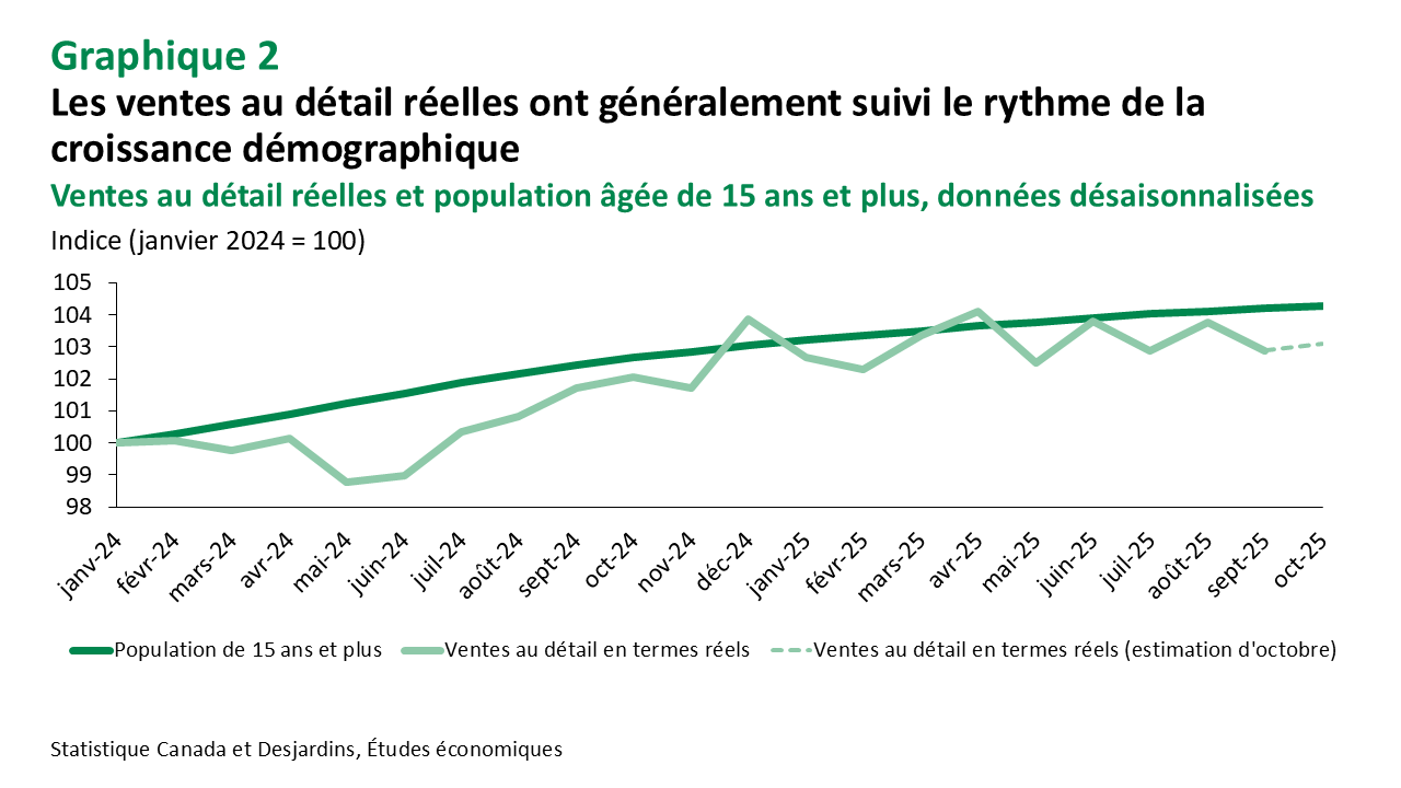 À la lumière des données publiées aujourd’hui, notre suivi du PIB pour le troisième trimestre demeure en ligne avec la prévision de la BdC, soit 0,5 %. Si les conditions du marché du travail continuent de s’améliorer, comme ce fut le cas en septembre et en octobre, nous anticipons que les ventes au détail devraient continuer de tenir le coup. Cela dit, les risques baissiers demeurent, notamment en raison de l’incertitude entourant l’issue des négociations commerciales avec les États‑Unis.