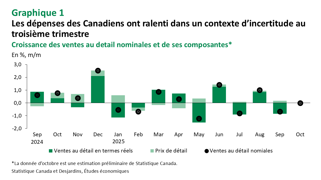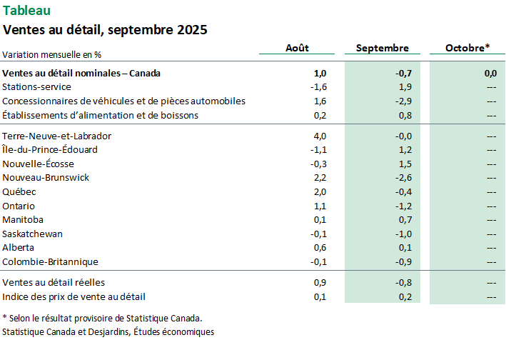 - En volumes, les ventes au détail ont fléchi de 0,8 % en septembre, ce qui place la croissance du troisième trimestre en territoire négatif (-1,2 % en rythme annualisé).
