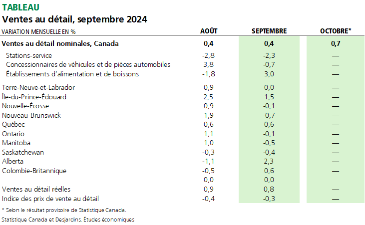 - Les ventes au détail ont augmenté de 0,4 % en septembre, ce qui correspond au résultat provisoire de Statistique Canada. Le tableau ci-dessous résume les principales données.