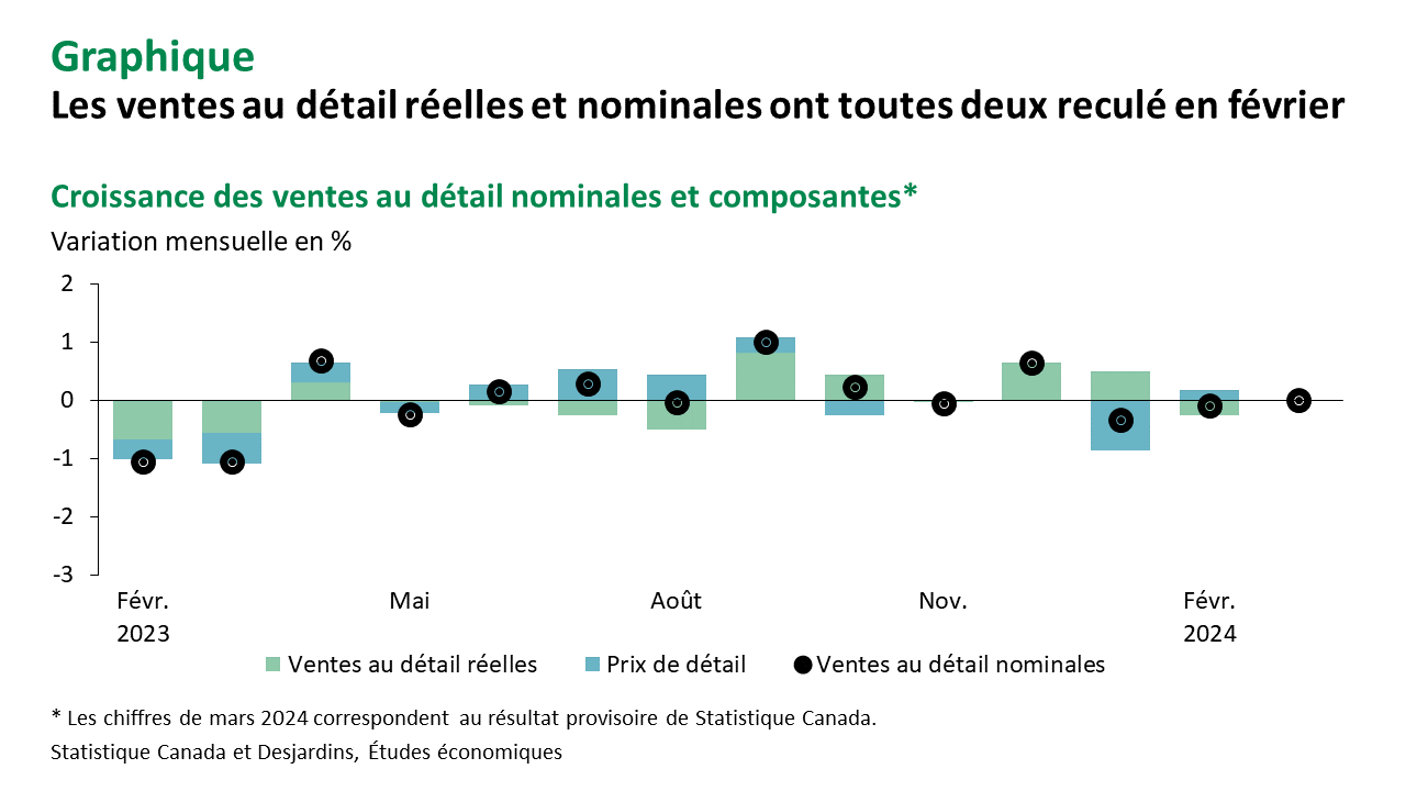 - La baisse des ventes au détail réelles (-0,3 %) est la plus prononcée depuis août dernier. La hausse des prix (+0,2 %) n’a pas permis de contrebalancer l’effet négatif des volumes sur les ventes au détail (graphique).